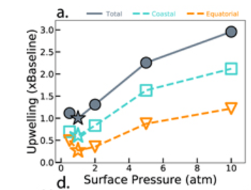 The planet's surface pressure also had an effect on upwelling currents. They found that as the pressure rose above 1 atm, upwelling increased as well. The effect of the wind becomes more pronounced as the atmospheric pressure increases.
