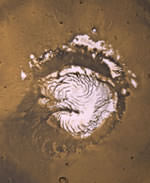 Another report, to be published in the Journal of Geophysical Research-Planets, combines measurements from Odyssey and Global Surveyor to provide indications of how densely the winter layer of carbon-dioxide frost or snow is packed at northern latitudes greater than 85 degrees. The Odyssey data are used to estimate the mass of the deposit, which can then be compared with the thickness to obtain a density. The dry-ice layer appears to have a fluffy texture, like freshly fallen snow, according to the report by Dr. William Feldman of Los Alamos National Laboratory, N.M., and 11 co-authors. The study also found that once the dry ice disappears, the remaining surface near the pole is composed almost entirely of water ice.