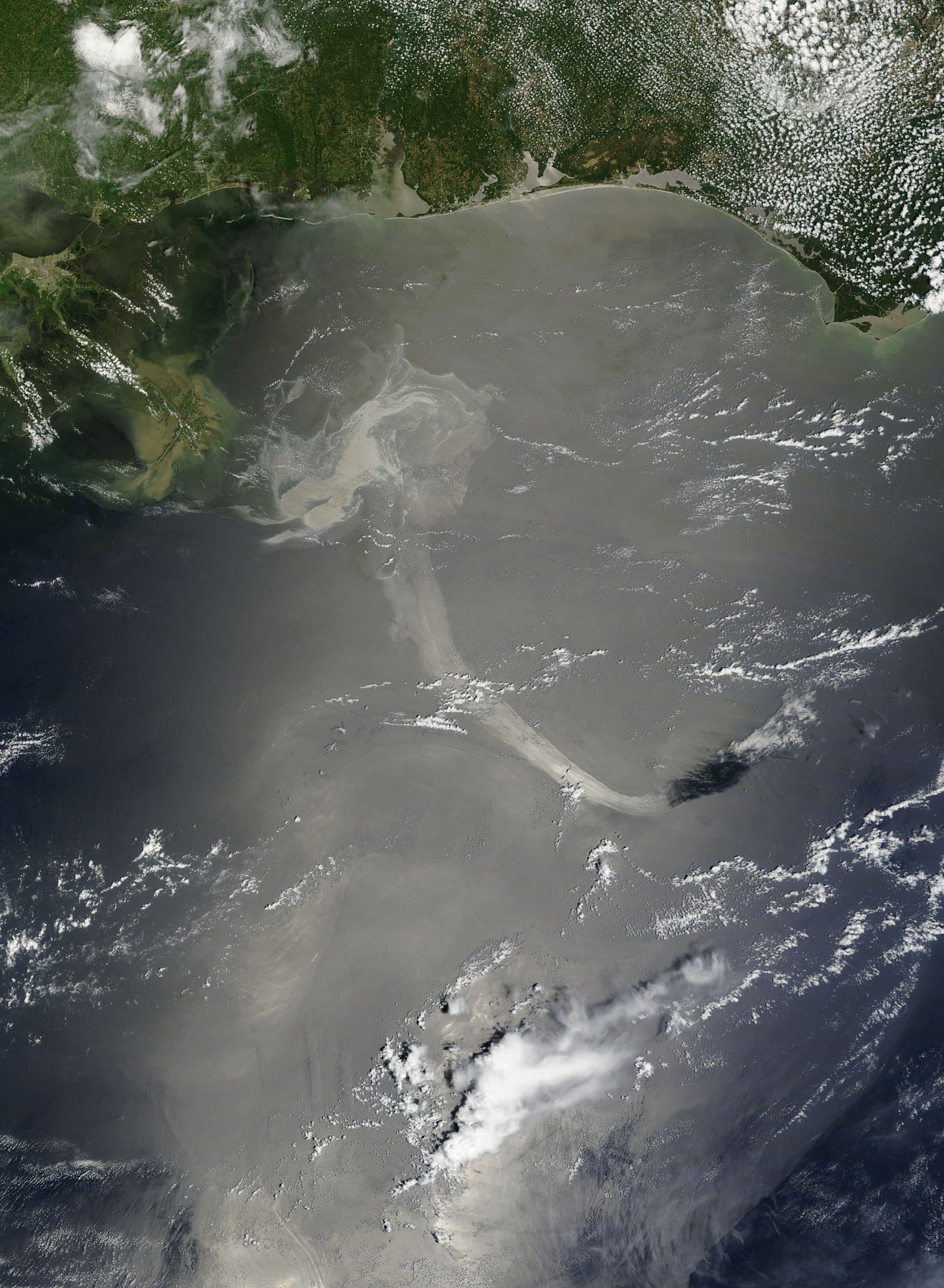 This unusual natural color image taken on May 18, 2010 by the Moderate Resolution Imaging Spectroradiometer (MODIS) on NASA's Aqua satellite shows sun glinting off the oil slick. The diagonal stripes result from the Sun's reflection on the ocean surface, called sunglint. The sunglint accentuates the left-to-right scans that the satellite sensor makes as it passes over the Earth's surface, and the stripes are perpendicular to the satellite's path.