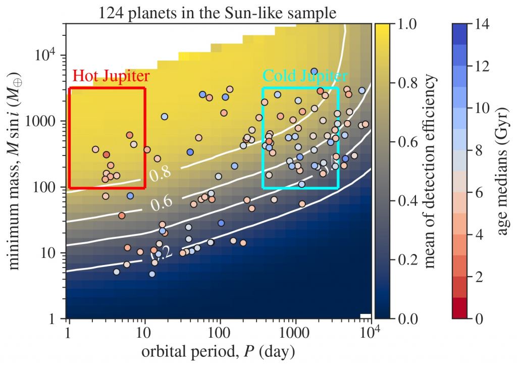 To begin with, there were more cold Jupiters than hot Jupiters, which is in contrast to the planets of red dwarfs. And the team noticed that younger stars were more likely to have hot Jupiters than older stars. So they used their sample to create a Bayesian model of hot Jupiters orbiting Sun-like stars. They found that statistically numbers drop off around the mid-life of the star, about 6 billion years. This suggests that while the orbits of cold Jupiters are stable over many billions of years, the orbits of hot Jupiters are not. It seems that hot Jupiter orbits destabilize over time so that they are eventually consumed by their star. As a result, hot Jupiters are rare for older Sun-like stars.