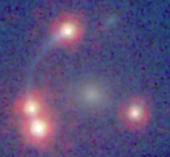 The water emission is seen as a maser, where molecules in the gas amplify and emit beams of microwave radiation in much the same way as a laser emits beams of light. The faint signal is only detectable by using a technique called gravitational lensing, where the gravity of a massive galaxy in the foreground acts as a cosmic telescope, bending and magnifying light from the distant galaxy to make a clover-leaf pattern of four images of MG J0414+0534. The water maser was only detectable in the brightest two of these images.