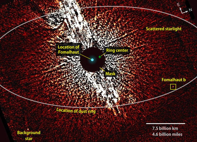 This visible-light image from the Hubble Space Telescope shows the vicinity of the star Fomalhaut, including the location of its dust ring and disputed planet, Fomalhaut b. A coronagraphic mask helped dim the star's brightness. This view combines two 2006 observations that were taken with masks of different sizes (1.8 and 3 arcseconds). (Credit: NASA/ESA/T. Currie, U. Toronto)