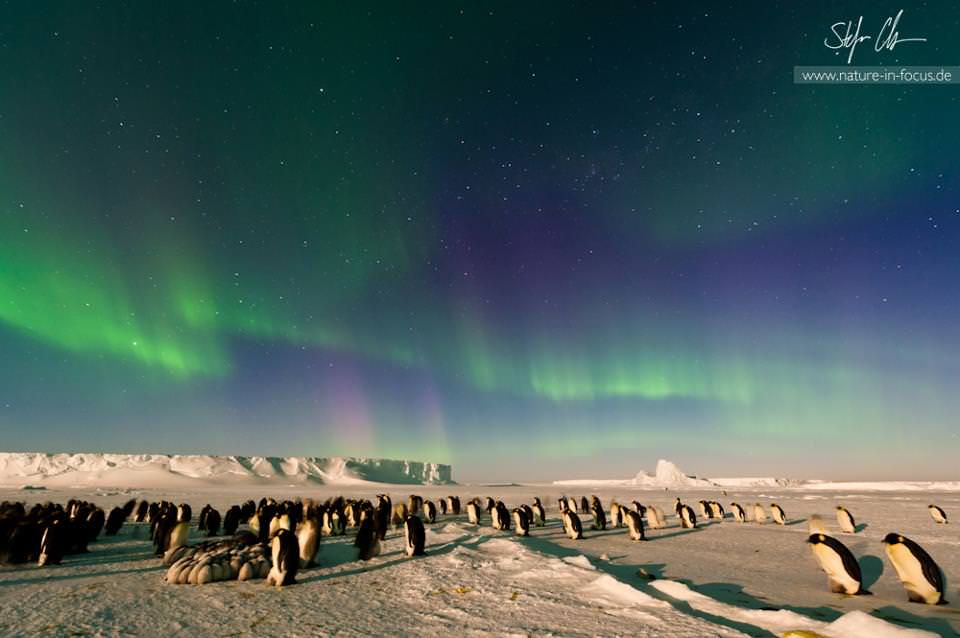 "The picture was taken at Atka-Bay on the sea-ice. The bay is roughly 8 km away from our station so the penguin colony is a popular destination for free-time trips. The idea of a photo of the Aurora Australis above the penguin colony had been in my head for a long time, but the conditions have to be just right --which usually never happens. You need a full Moon, high magnetic activity and a cloudless sky. Also the penguins should be standing close enough to the ice-berg. I made multiple attempts to get the photo, but we either had incoming clouds, low activity or had to cancel our stay because of wind picking up (which can be really dangerous out on the sea-ice)."