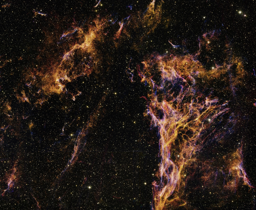 The entire structure of the Cygnus Loop, the gaseous remains of a supernova that occurred 5,000 – 10,000 years ago, covers an area nearly 45 times the size of the full Moon in the sky.