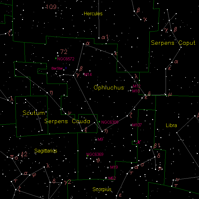 The sprawling constellation of Ophiuchus sits on the celestial equator and was one of the 48 original constellations charted by Ptolemy and later adopted by the IAU. Of the 13 zodiacal constellations (constellations through which the Sun passes during the course of the year), Ophiuchus is the only one not designated as an astrological sign. It covers 948 square degrees of sky and ranks 11th in size. Ophiuchus contains 10 main stars in its asterism and has 62 Bayer Flamsteed designated stars within its confines. Ophiuchus is bordered by the constellations of Hercules, Serpens Caput, Libra, Scorpius, Sagittarius, Serpens Cauda and Aquila. It is visible to all observers at latitudes between +80° and ?80° and is best seen at culmination during the month of July.
