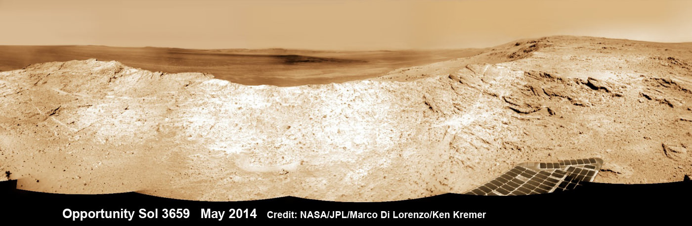 NASA's Opportunity Mars rover captures sweeping panoramic vista near the ridgeline of 22 km (14 mi) wide Endeavour Crater's western rim. The center is southeastward and also clearly shows the distant rim. See the complete panorama below. This navcam panorama was stitched from images taken on May 10, 2014 (Sol 3659) and colorized. Credit: NASA/JPL/Cornell/Marco Di Lorenzo/Ken Kremer-kenkremer.com More mosaics and 10 year route map below[/caption]