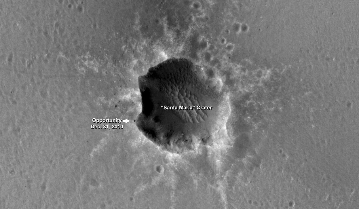 [caption id="attachment_82183" align="aligncenter" width="580" caption="Opportunity rover at the SW rim of Santa Maria Crater on New Year's Eve 2010 - Sol 2466. The rover sits at the edge of the crater rim and was photographed from Mars orbit by the HiRISE camera aboard NASA's Mars Reconnaissance Orbiter. Look closely to see the rover tracks on the left as Opportunity approached the westerm rim of Santa Maria crater. Credit: NASA/JPL/University of Arizona"]