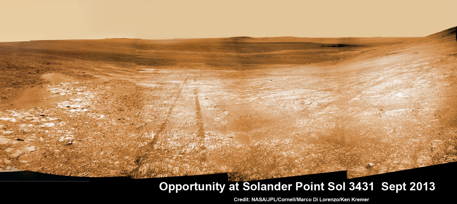 Opportunity starts scaling Solander Point - her 1st mountain climbing goal See the tilted terrain and rover tracks in this look-back panoramic view from Solander Point peering across the vast expanse of huge Endeavour Crater. Opportunity will ascend the mountain looking for clues indicative of a Martian habitable environment. This navcam camera mosaic was assembled from raw images taken on Sol 3431 (Sept.18, 2013). Credit: NASA/JPL/Cornell/Marco Di Lorenzo/Ken Kremer (kenkremer.com). [/caption]