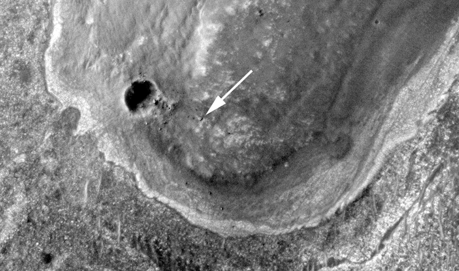 Look very closely and you'll even be able to easily discern the rovers pair of tire tracks showing the path traversed by the robot as she explores the crater and the ejecta rocks and boulders excavated and strewn about by an ancient impact.