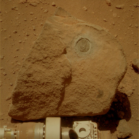 Caption: Opportunity leaves a mark on the Marquette Island rock on Mars. Credit: NASA/JPL/U of AZ, colorization by Stuart Atkinson