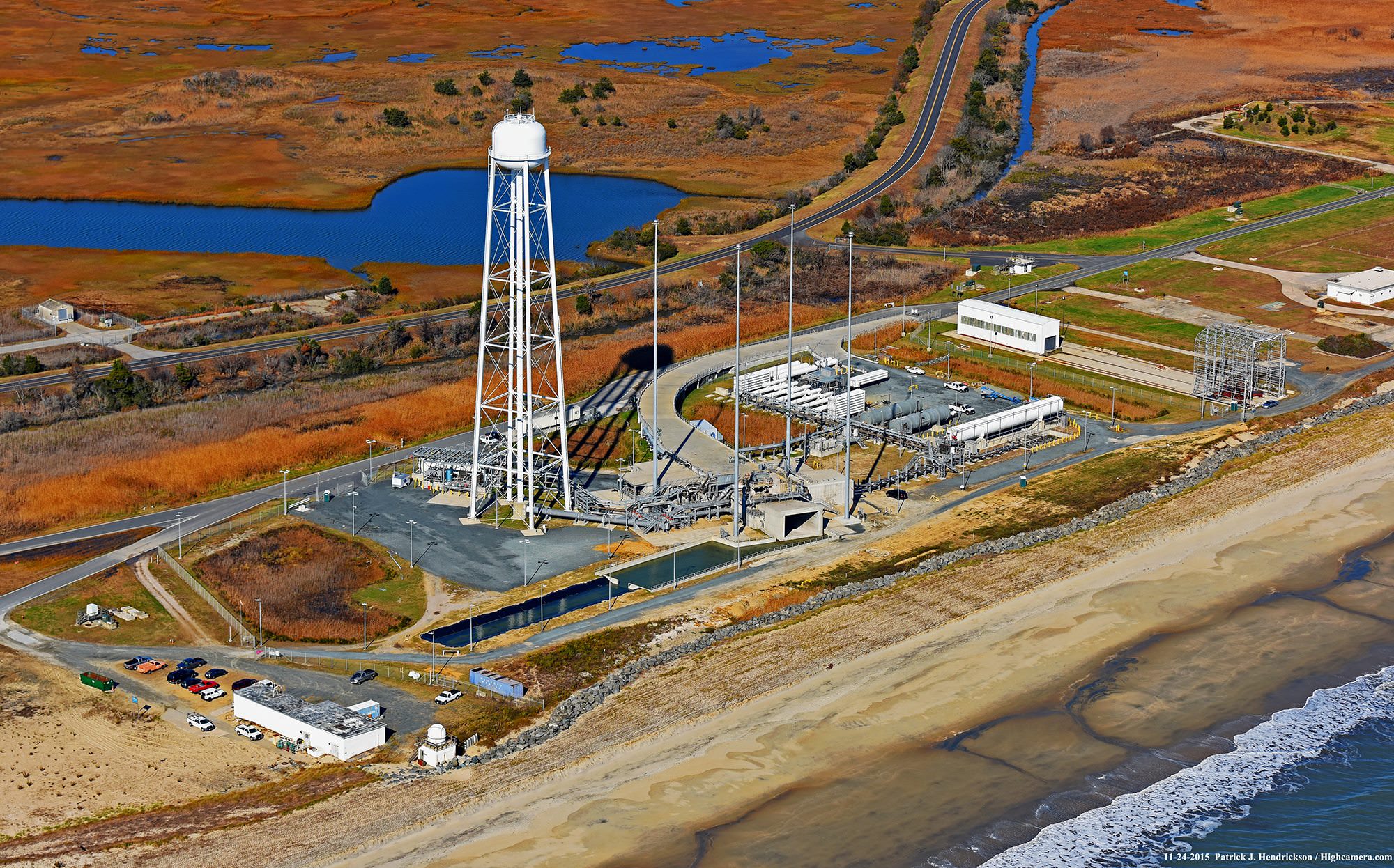 Aerial view of Orbital ATK launch pad at Virginia Space's Mid-Atlantic Regional Spaceport (MARS) Pad 0A located at NASA's Wallops Flight Facility. Credit: Credit: Patrick J. Hendrickson / Highcamera.com[/caption]