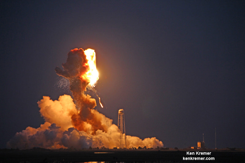 Orbital Sciences Antares rocket explodes violently and is consumed in a gigantic aerial fireball seconds after blastoff from NASA's Wallops Flight Facility, VA, on Oct. 28, 2014 at 6:22 p.m. Credit: Ken Kremer – kenkremer.com[/caption]