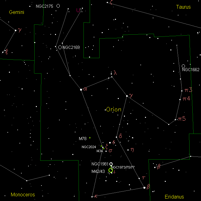 The constellation of Orion resides on the celestial equator and is one of the most brilliant and recognized in the world. It was part of Ptolemy's original constellation charts and remains as one of the 88 modern constellations adopted by the International Astronomical Union. Orion spans 594 square degrees of sky, ranking 26th in overall size. It contains 7 main stars in its asterism and has 81 Bayer Flamsteed stars within its confines. Orion is bordered by the constellations of Gemini, Taurus, Eridanus, Lepus and Monoceros. It is visible to all observers located at latitudes between +85° and ?75° and is best seen at culmination during the month of January.