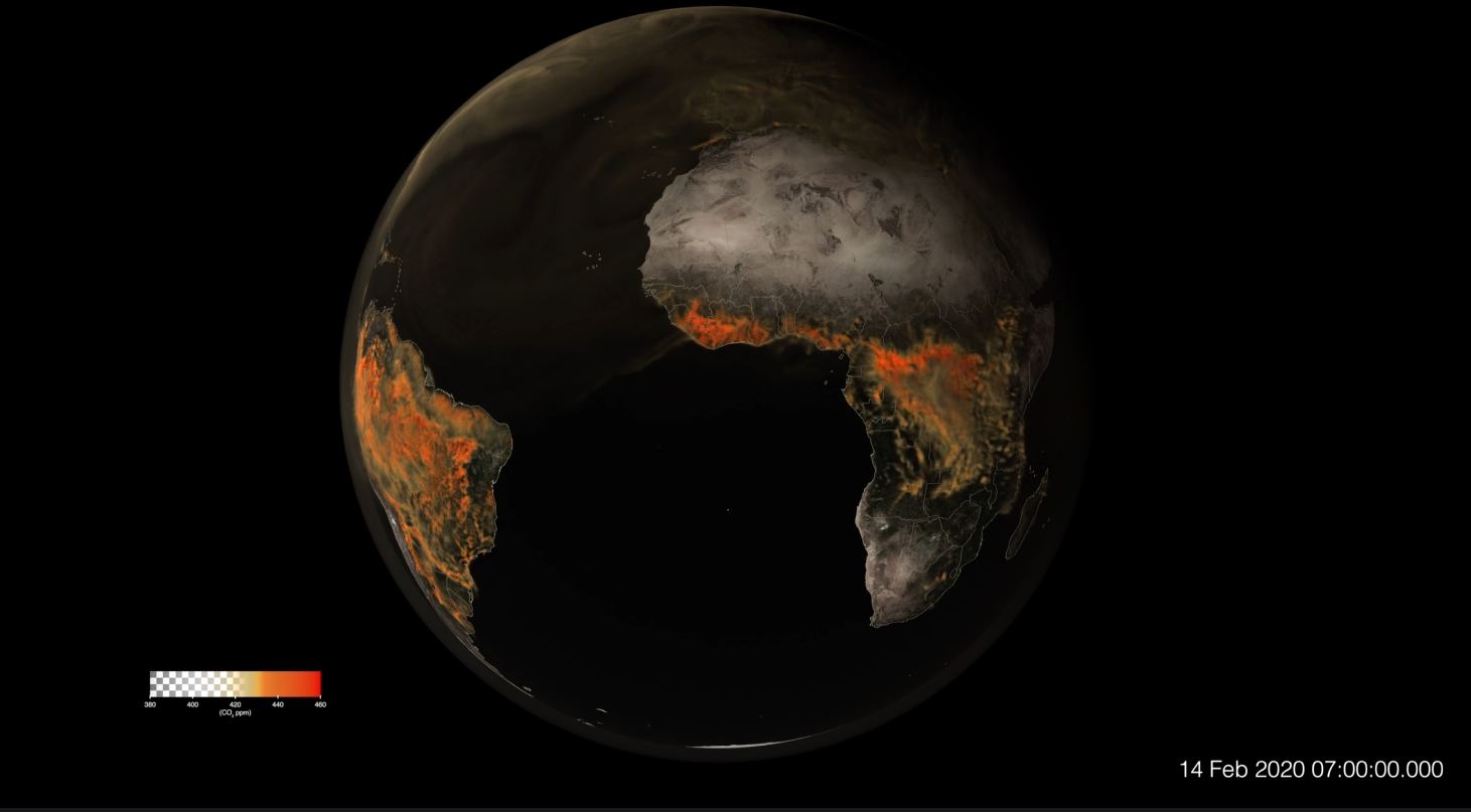 Above the USA, South Asia, and China, most of the carbon comes from industry, power plants, and transportation. But over Africa and South America, most of the emissions come from burning, including forest fires, agricultural burning, and land clearing. Emissions also come from fossil fuels like oil and coal.