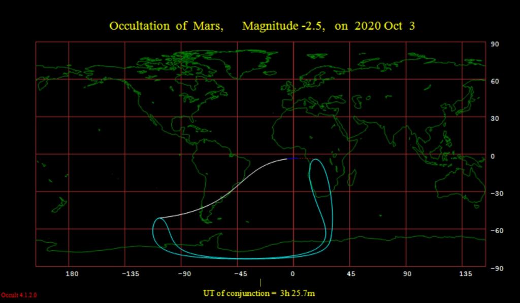 Also, keep an eye out for the final occultation of Mars in a series for 2020 on the evening of Oct 2/3rd for the southern tip of South America—the rest of us will see a near miss. This is very near opposition on the 13th, and the Full Harvest Moon on October 1st. The Moon won't occult Mars again until April 17, 2021.
