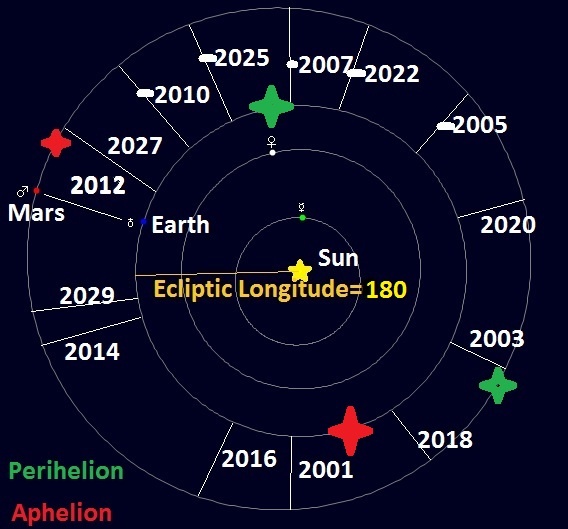 What's actually happening during opposition from a heliocentric point of view is that the speedy Earth is lapping pokey Mars on the inside track of the solar system. Mars takes 687 Earth days to travel around the Sun, and oppositions occur about once every 26 months. Mars also appears to move westward in retrograde around this time versus the distant starry background, a motion that so confounded early astronomers. Demoting the Earth from the center of the solar system to just another planet in orbit around the Sun did the trick, doing away with the need to evoke crystalline spheres and arcane epicycles to explain the apparent motion of the planets. In 2020, Mars resumes prograde (eastward) motion on November 13th.