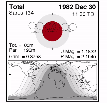 It's fascinating to contemplate the 54-year span of three saros cycles known as an exeligmos, bringing the eclipse cycle back around to the same longitude. For example, we caught member 25 of this same series as a chilly early morning eclipse on January as a teenager on December 30th, 1982, then caught the next eclipse in the series from Italy while in the military on the morning of January 9 th , 2001, before seeing this eclipse setting from the shores of Spain in 2019.