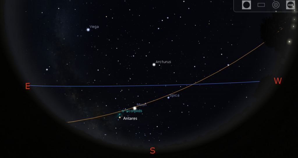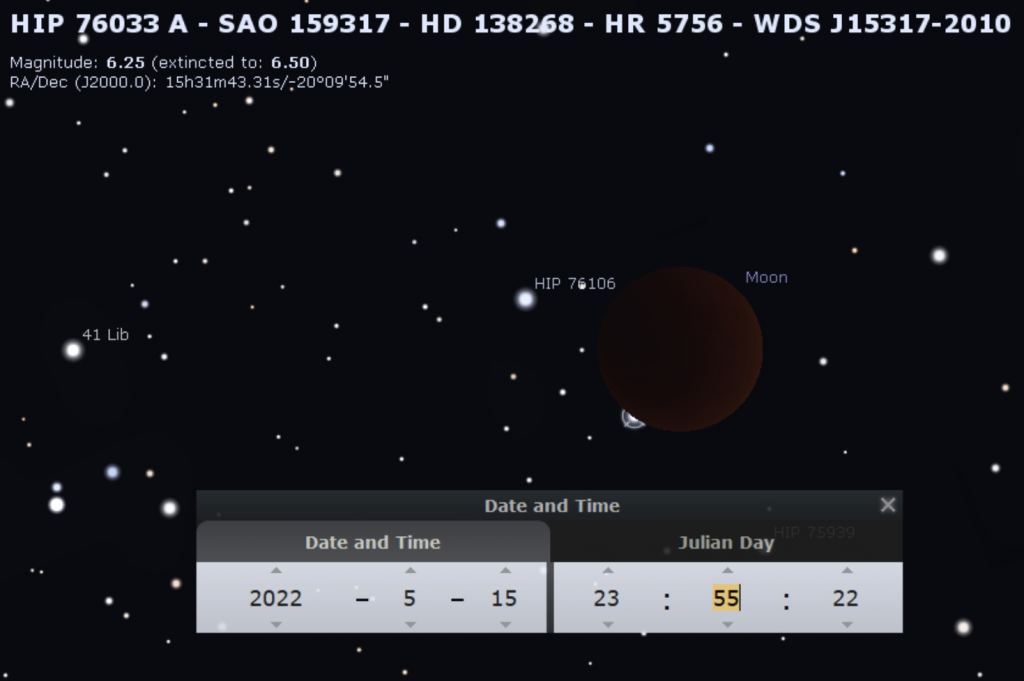 Also, the Moon will occult the +6.3 magnitude double star SAO 159317 in the constellation Libra the Scales for North America during totality. This will be a good practice run observation for a rare event later this year during the next total lunar eclipse on November 8th, when the Moon occults the planet Uranus near totality.
