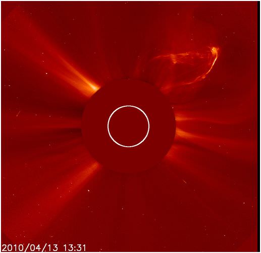 The Sun erupted with one of the biggest prominences in years. This shot from the SOHO spacecraft on April 13, 2010 at 13:13 UT shows a Coronal Mass Ejection from the Sun's northeastern limb. The massive plasma-filled structure rose up and burst during a ~2 hour period around 0900 UT.