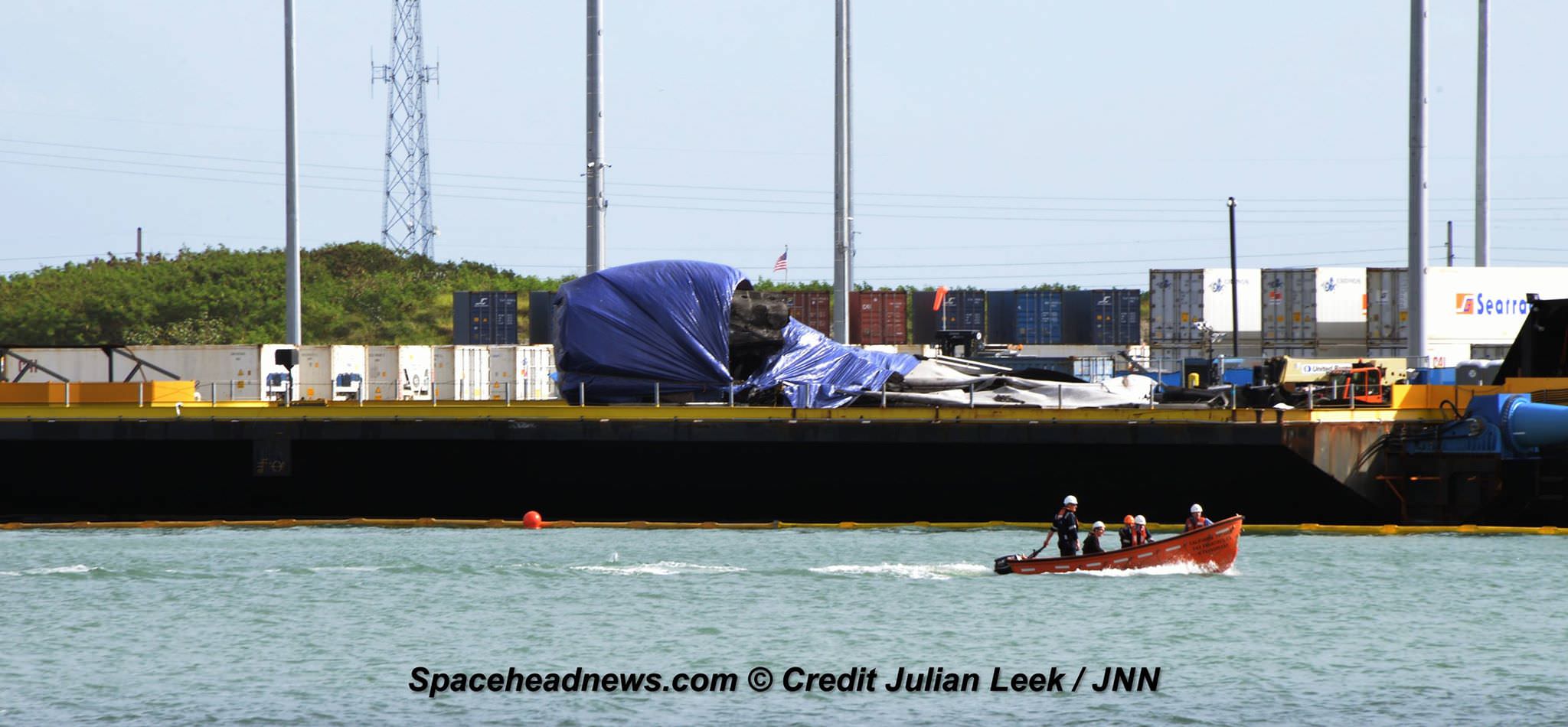 Video Caption: SpaceX booster remains from Eutelsat-ABS launch seen in Port Canaveral on 06-19-2016 the day after arrival. The wind blew off part of the tarps covering what is left of Eutelsat-ABS booster. Credit: USLaunchReport