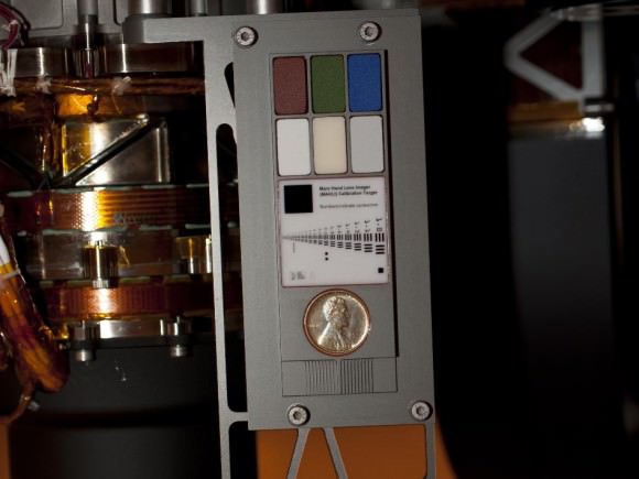 Curiosity's calibration target, shown before launch. Two instruments at the end of the robotic arm on NASA's Mars rover Curiosity use the calibration targets attached to a shoulder joint of the arm. Credit: NASA/JPL-Caltech[/caption]