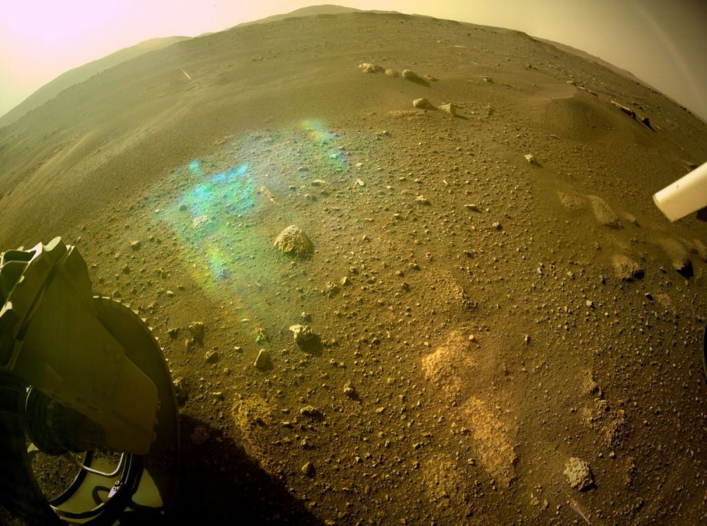 Did the Perseverance rover capture a rainbow on Mars? This image, from the rover's left rear Hazard Camera, sure looks like it. But alas, no. However, film director JJ Abrams would be proud.