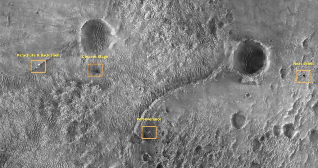 Earlier in the landing sequence, Perseverance jettisoned its heatshield and parachute which crashed in the separate locations, but HiRISE found them as well: