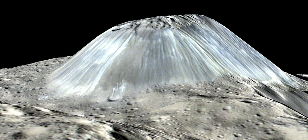 Whoa - what a sight! Ceres' lonely mountain, Ahuna Mons, is seen in this simulated perspective view. The elevation has been exaggerated by a factor of two. The view was made using enhanced-color images from NASA's Dawn mission in August from an altitude of 240 miles (385 km) in August 2016. Credit: NASA/JPL-Caltech/UCLA/MPS/DLR/IDA/PSI[/caption]