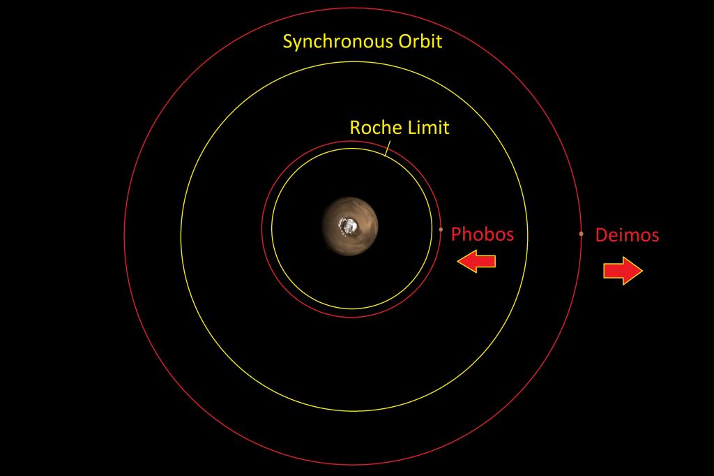 "There exists a critical altitude which is called the synchronous radius," Michael Efroimsky (U.S. Naval Observatory) told Universe Today. "If the moon is below the synchronous radius, the tides of the planet will drag the moon down. This is the case with Phobos"