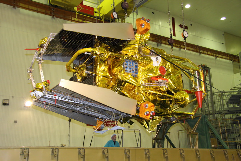 [caption id="attachment_90046" align="aligncenter" width="386" caption="Tilted view of Phobos-Grunt attached to test stand for final prelaunch processing. Credit: Roskosmos."]