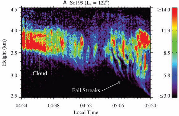 The LIDAR instrument emits pulses of laser light upward into the atmosphere, and then detects the backscatter from dust and clouds. The researchers were able to observe that water-ice crystals grow large enough to precipitate through the atmosphere at night and sublimate into water in the morning. The water vapor on the ground is then mixed back up through the air by turbulence and convection – reaching a height of about two and a half miles (four kilometers) – before again forming clouds at night.