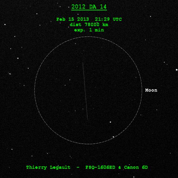 A 30 second exposure of Asteroid 2012 DA14 passing by Theta Crateris on Feb. 15, 2013 at 19:22 UTC, as seen from Malaysia. The Moon is added for comparison.Credit: Shahrin Ahmad[/caption]