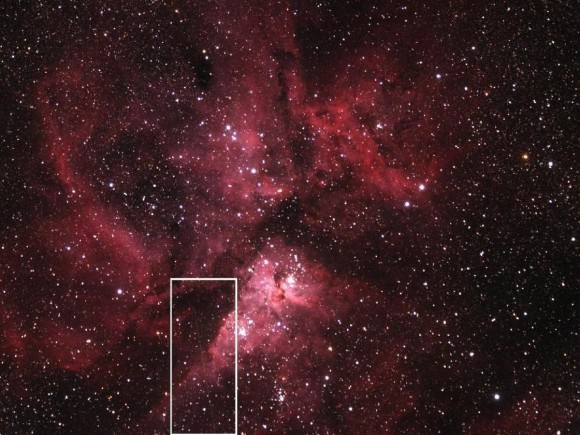 This image shows asteroid 2012 DA14 and the Eta Carinae Nebula, with the white box highlighting the asteroid's path. The image was taken using a 3" refractor equipped with a color CCD camera. The telescope is located at the Siding Spring Observatory in Australia and is maintained and owned by iTelescope.net. Credit: Aaron Kingery/NASA/MSFC[/caption]