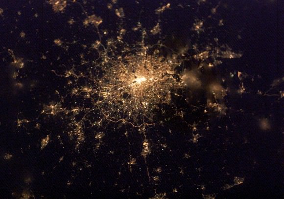 This space pic from night shows the city of London. You can see the brightest areas are the most densely populated, and the less dense areas are dimmer. You can see the ring road that surrounds London, as well as the path of the Thames river.