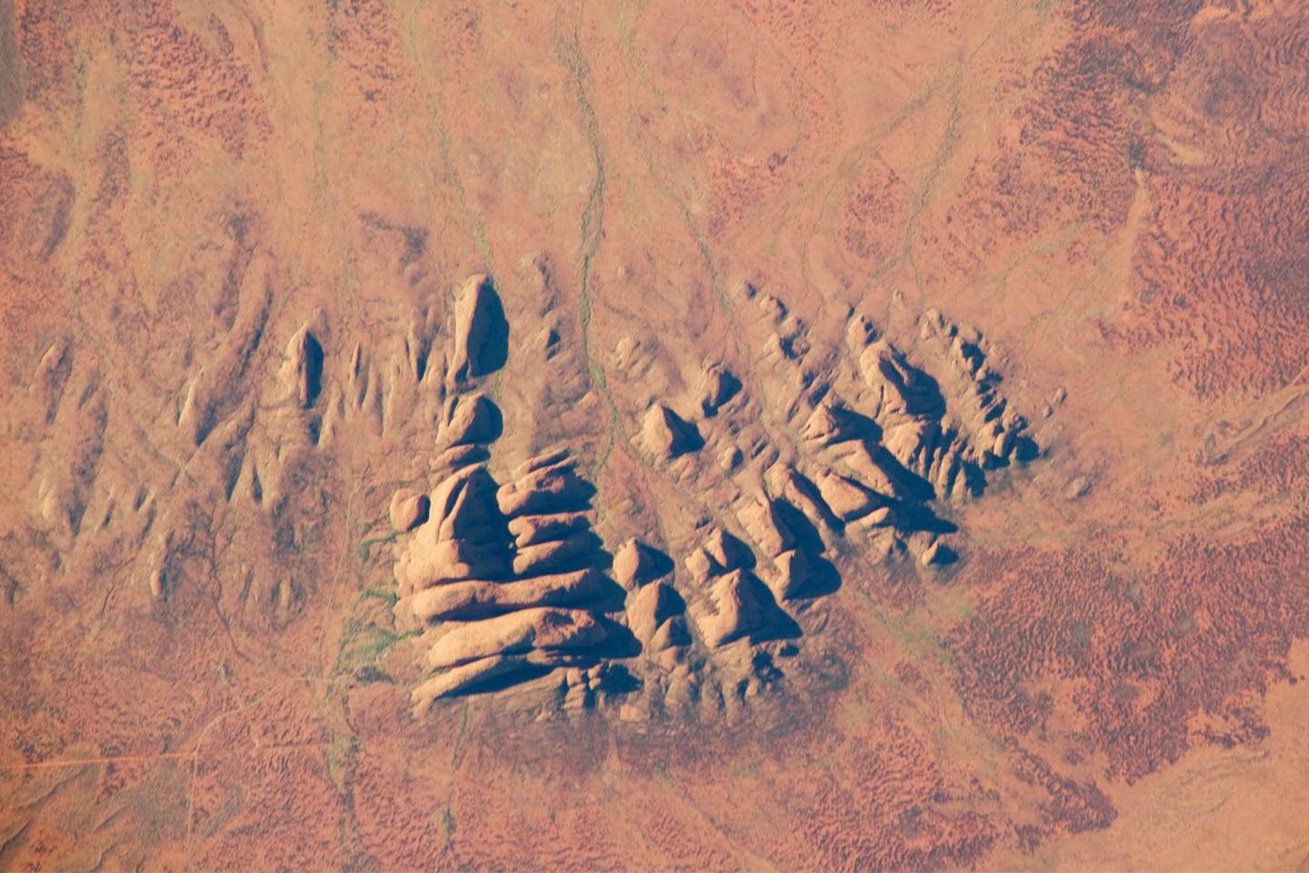 This is a photograph of Uluru-Kata Tjuta National Park, an isolated region in Australia's Northern Territory. It's famous for these isolated mountains known as inselbergs.