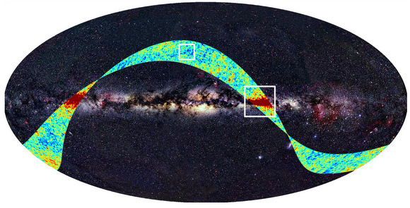 The large red strips trace radio emission from the Milky Way, whereas the small bright spots high above the galactic plane correspond to emission from the Cosmic Microwave Background itself.