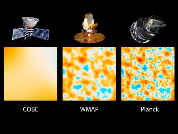 This graphic shows the evolution of satellites designed to measure the light left over from the Big Bang that created our Universe about 13.8 billion years ago. Called the cosmic background radiation, the light reveals information about the early Universe. The three panels show the same 10-square-degree patch of sky as seen by NASA's Cosmic Background Explorer, or COBE, NASA's Wilkinson Microwave Anisotropy Probe, or WMAP, and Planck. Planck has a resolution about 2.5 times greater than WMAP. Credit: NASA/JPL-Caltech/ESA [/caption]