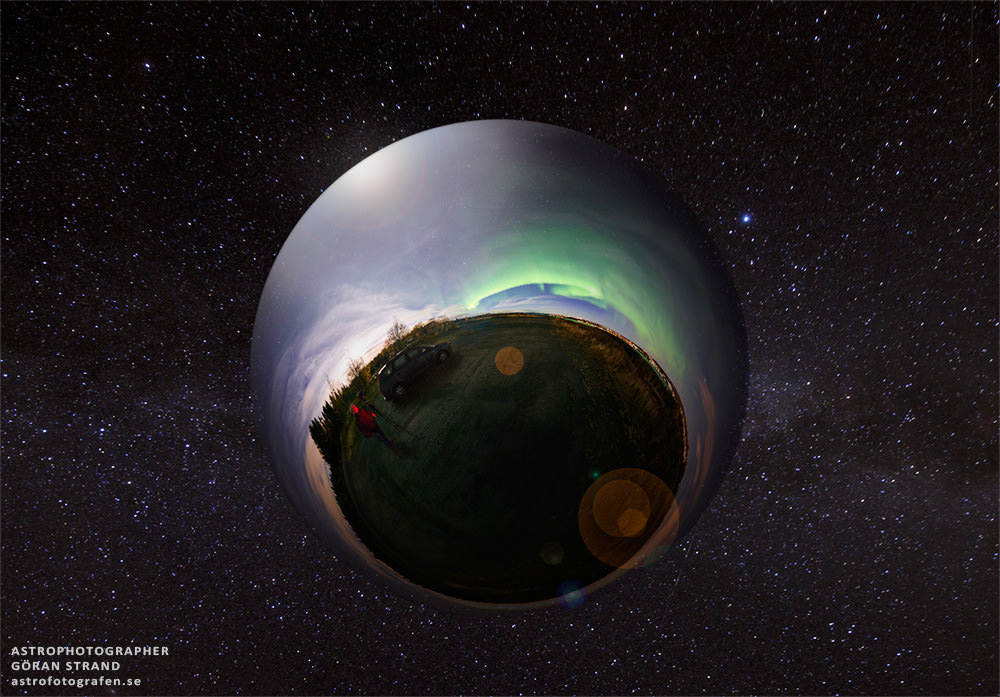 . "I've made a small world trapped inside a bubble floating in space. And a lonely photographer is trying to capture the ongoing aurora with his camera."