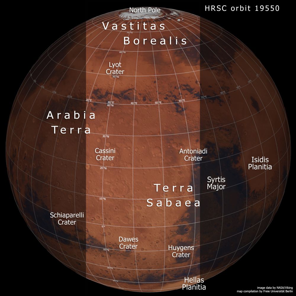 The part of the southern highlands visible in the main image are Arabia Terra (towards the upper left) and Terra Sabaea (to the middle and lower right. At the bottom and almost out of sight is the massive Hellas Planitia, a large plain inside the Hellas impact basin.