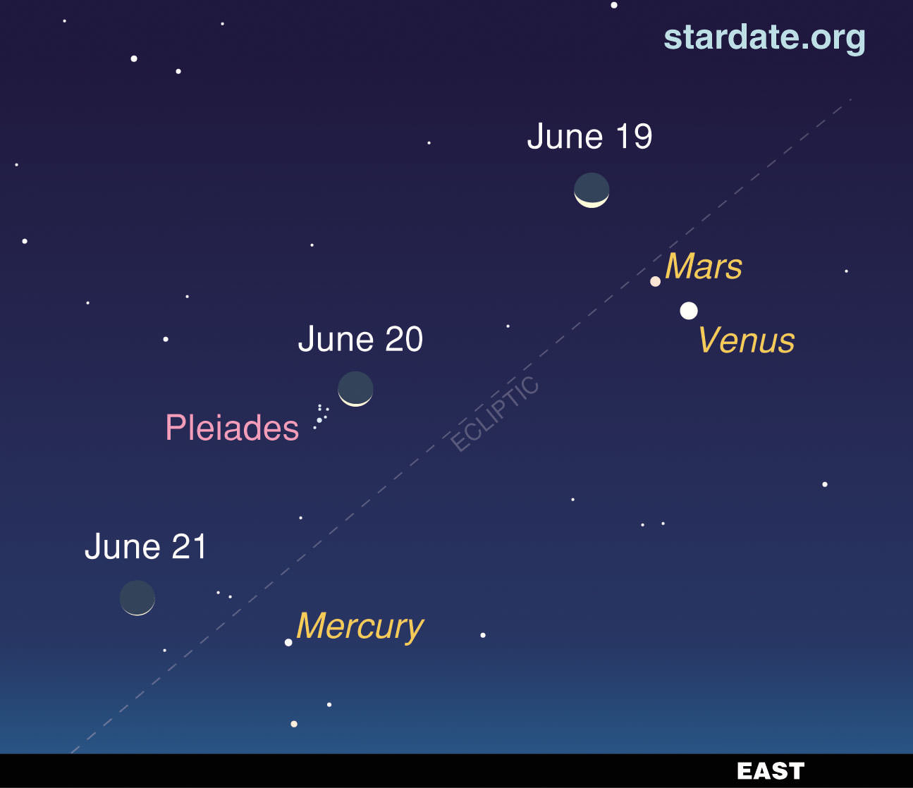 Starting before dawn on June 19, look for Venus blazing as the 'morning star' due east around an hour to 45 minutes before local sunrise. Fainter Mars will be a little to its lower left, with Mercury a good bit farther to the lower left. Although Mercury looks like a bright star, it will be so low in the sky that you may need binoculars to pick it out of the lower sky haze.