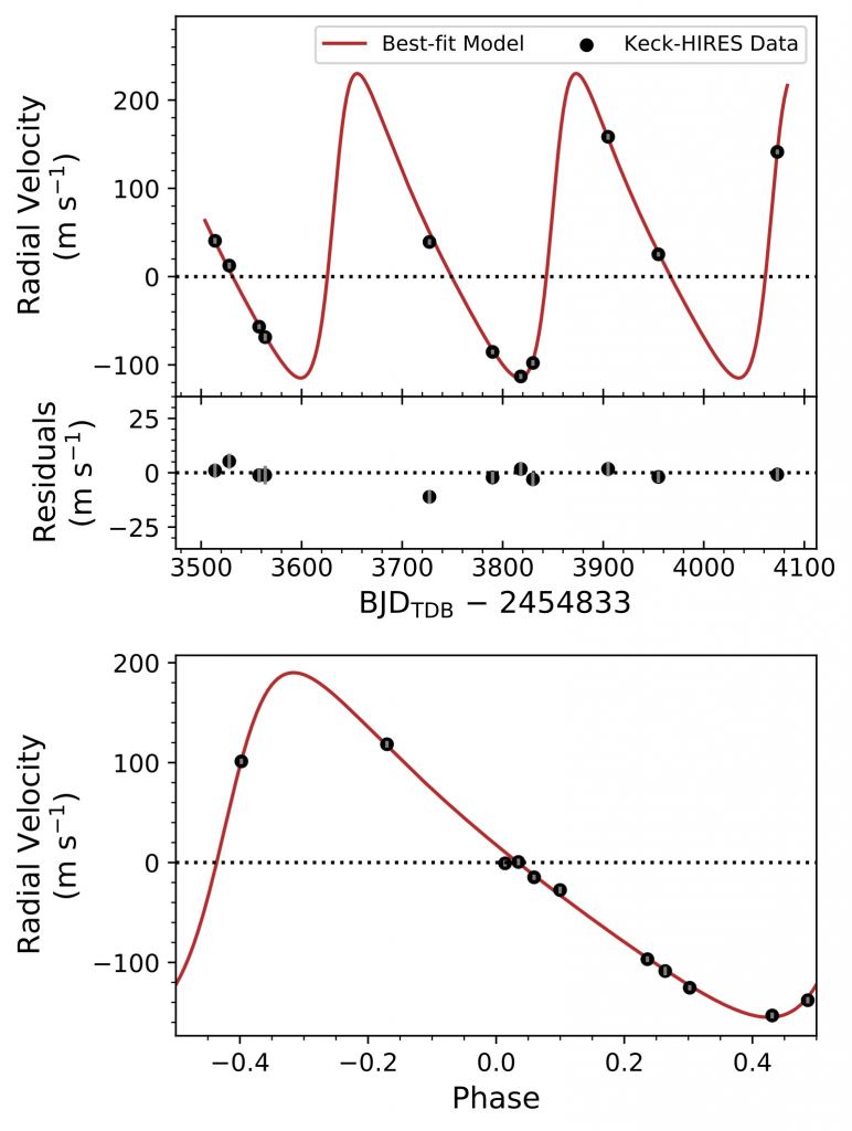 In this latest work, the team used a different way to study exoplanets known as the radial-velocity method. As a planet orbits its star, it tugs on the star gravitationally, causing the star to wobble slightly. When a star wobbles toward and away from us, the light of the star is shifted a bit to the blue and red in a regular pattern due to the Doppler effect. This method is particularly useful for large planets, and it can be used to measure a planet's mass since the amount of wobble depends on the mass of the planet.