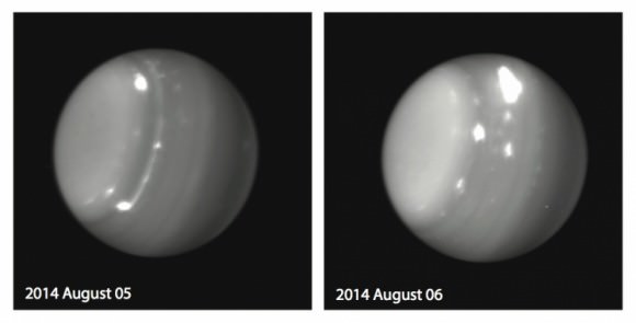 Huge storms on Uranus were spotted by the Keck Observatory on Aug. 5 and Aug. 6, 2014. Credit: Imke de Pater (UC Berkeley), Pat Fry (University of Wisconsin), Keck Observatory