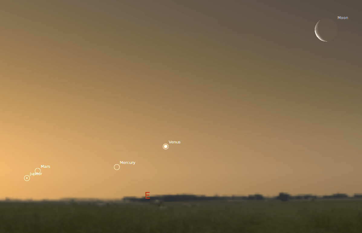 Bright Venus will be easy to spot first, then Mercury followed by Jupiter. The real challenge is to find Mars which will be very close to Jupiter. See the above diagram for help on where each object is located.