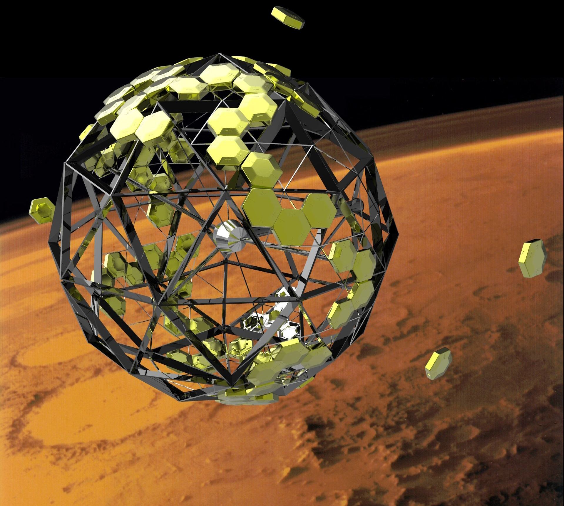 Once in Martian orbit, the ship-sphere would stop rotating to allow each element to detach and begin descending to the Martian surface, using a system of parachutes, thrusters and air resistance to slow down and land. Each module would be equipped with four motorized legs that would allow them to move around on the surface and connect with the other habitation modules once they arrive.
