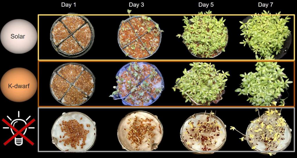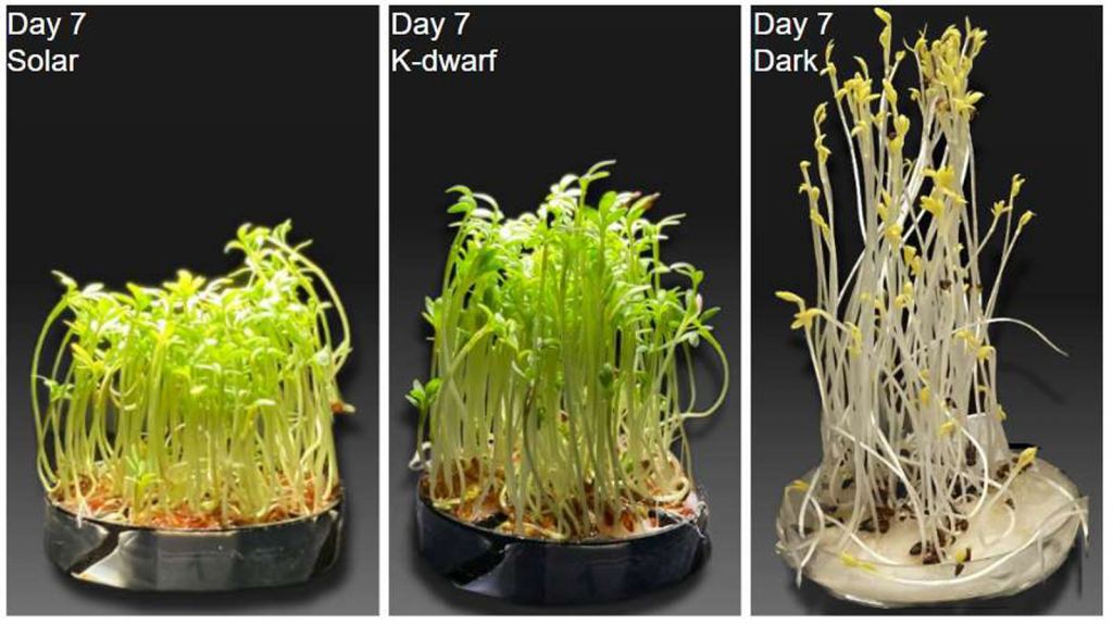 The trio of researchers exposed watercress seedlings to three different light regimes: sunlight, K-dwarf light, and no light. Visually, the solar and K-dwarf samples were similar, though most of the time, the seeds sprouted a day or two earlier than under solar light. The K-dwarf sample also had marginally larger leaf surface area.