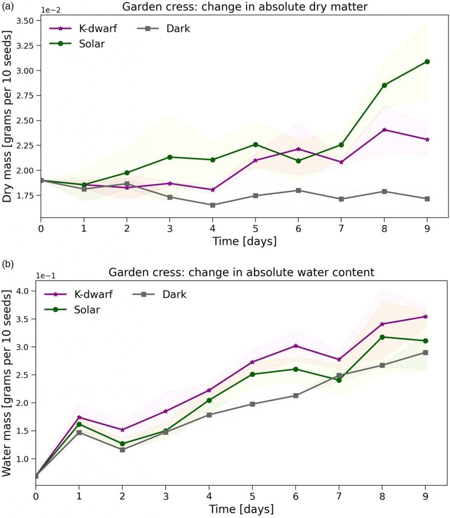 The researchers also measured water content and dry mass. Under K-dwarf conditions, the watercress had slightly higher water content, while the dry content was lower compared to solar conditions.