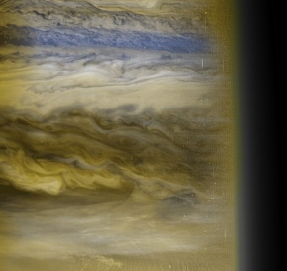A composite of Jupiter's bands (and atmospheric structures) taken in several images by the New Horizons Multispectral Visual Imaging Camera, showing differences due to sunlight and wind. Credit: NASA/Johns Hopkins University Applied Physics Laboratory/Southwest Research Institute[/caption]