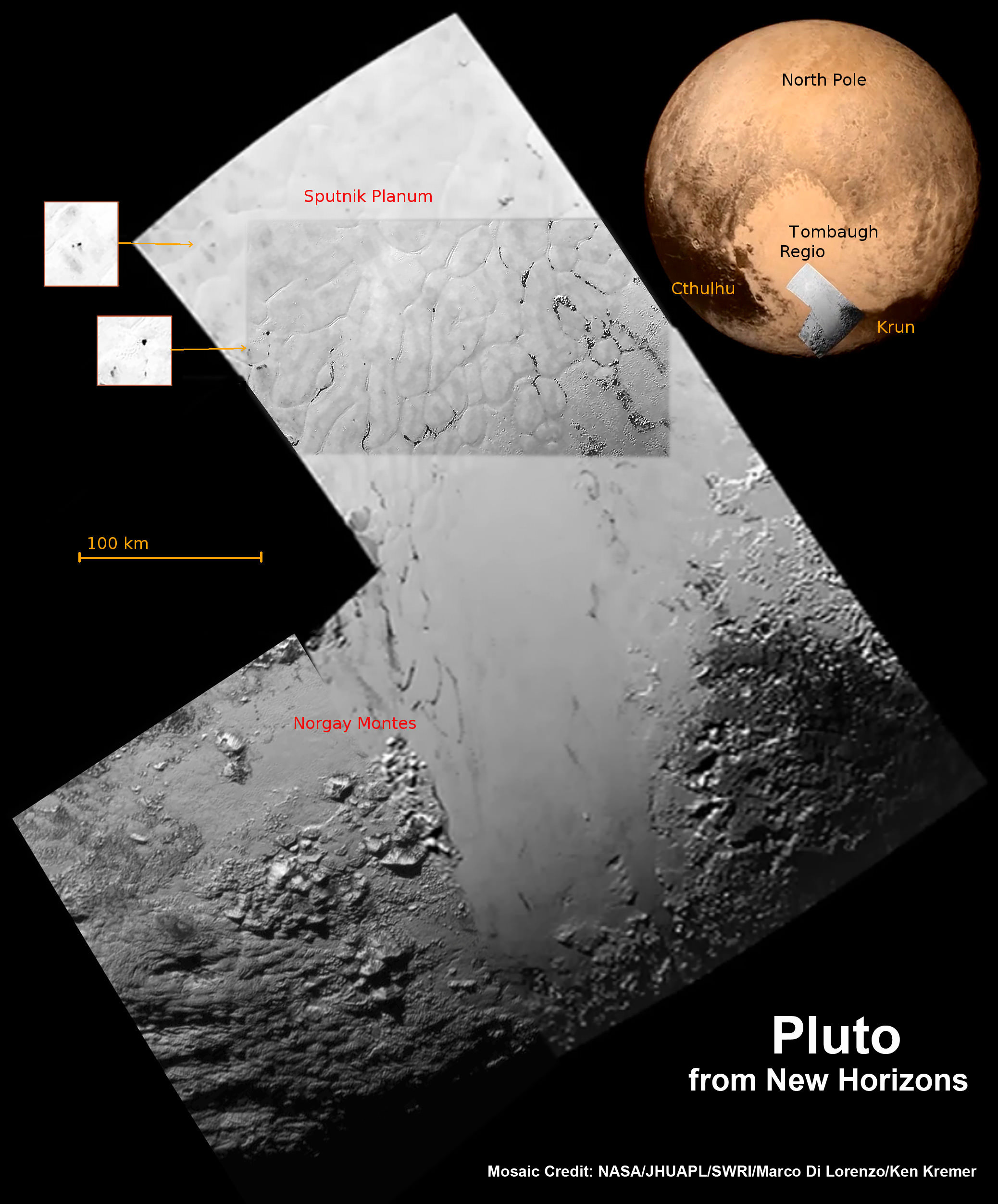 by humanity's first spacecraft ever to visit the last planet in our solar system revealed unanticipated new discoveries of ice mountains as tall as the Rockies and vast craterless plains spanning hundreds of miles (kilometers) across - are now shown in our newly created context mosaic (featured above and below) of the heart-shaped 'Tombaugh Regio' area that dominates the