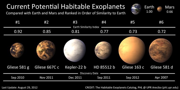 Artistic representation of the current five known potential habitable worlds. Will this list broaden under a new habitability model? Credit: The Planetary Habitability Laboratory (PHL)