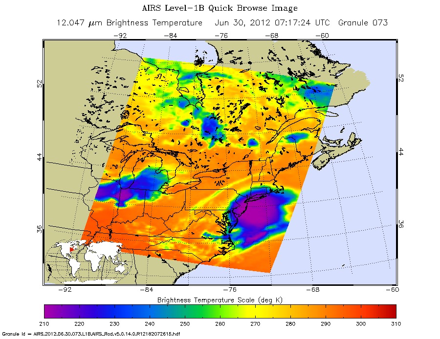 The AIRS images for June 30 show areas of intense convection centered off the New Jersey coast and another, less intense, system over Iowa-Indiana-Ohio. The area off the New Jersey coast is no longer a rapidly moving linear front. The near-surface atmospheric temperatures over the South and Midwest had decreased by 10 to 15 Fahrenheit in most areas," Olsen said.